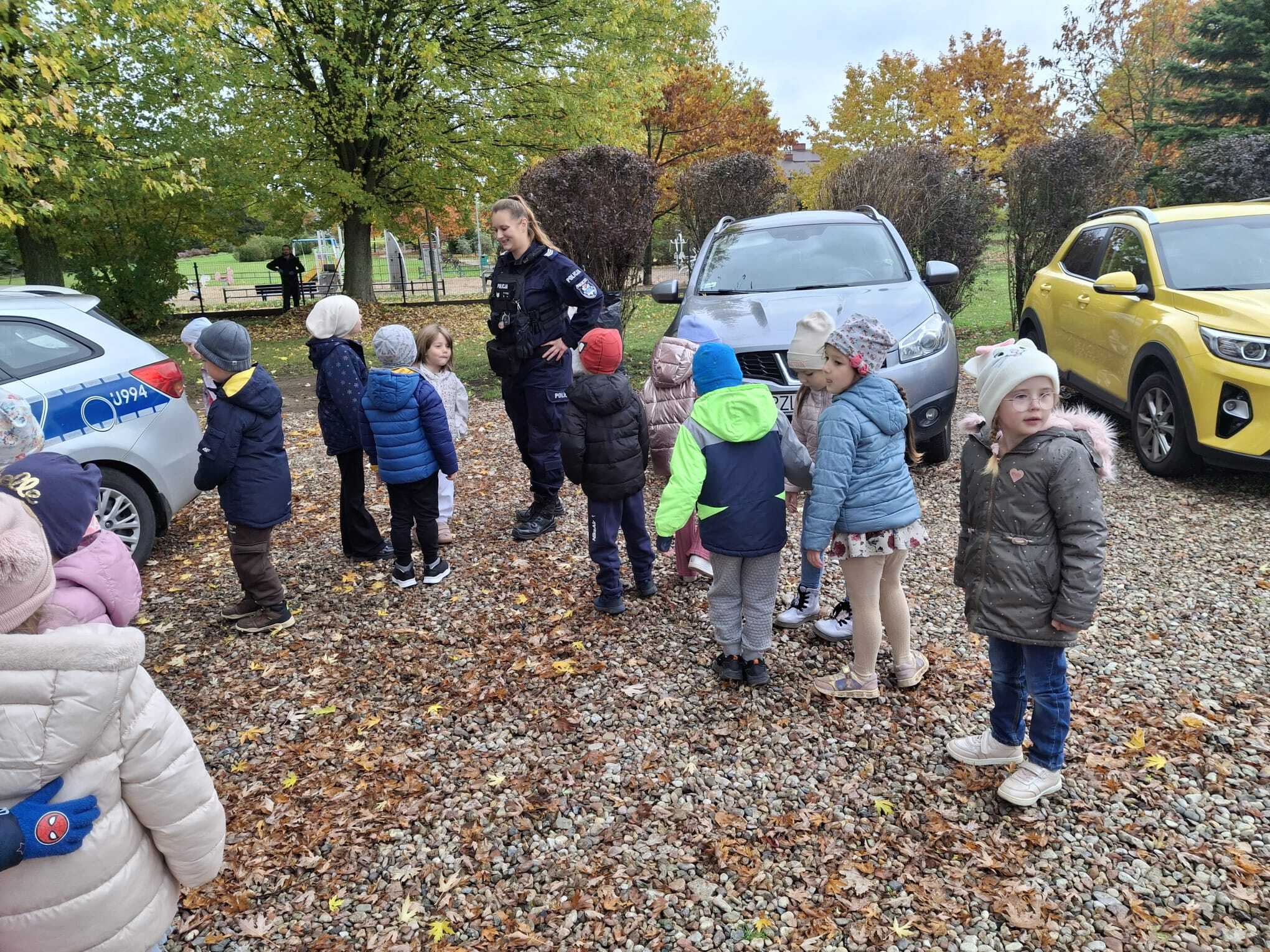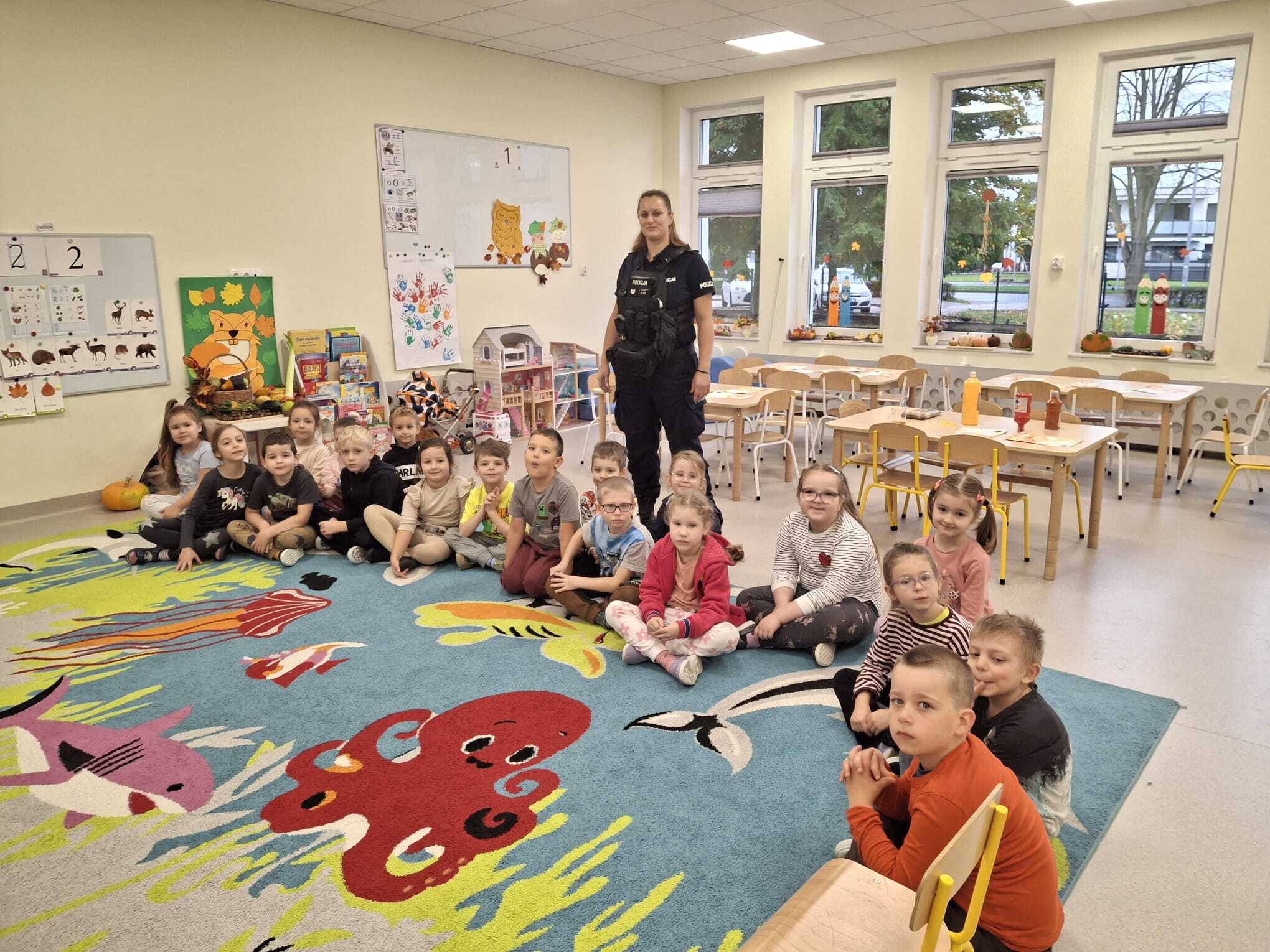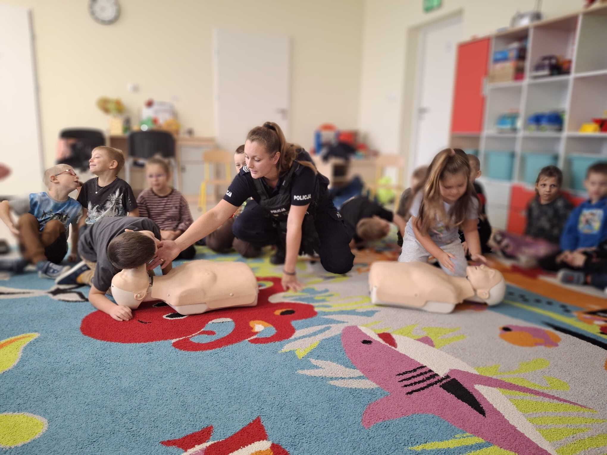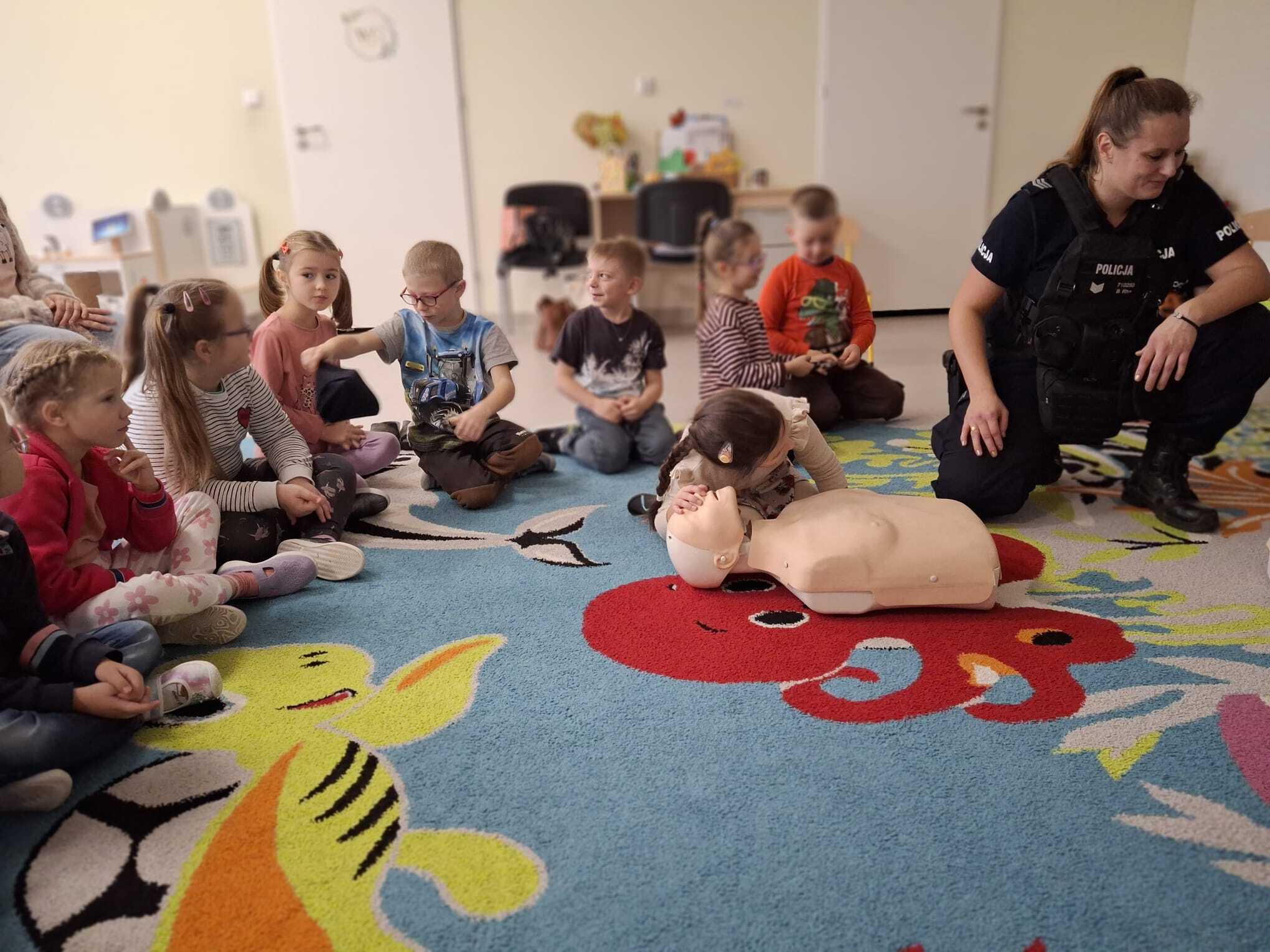 Dzisiaj grupa "Literki" i "Pszczółki" gościły w sali Panią policjant, która przekazała im wiedzę na temat udzielania pierwszej pomocy. Dzieci również mogły z bliska obejrzeć radiowóz.